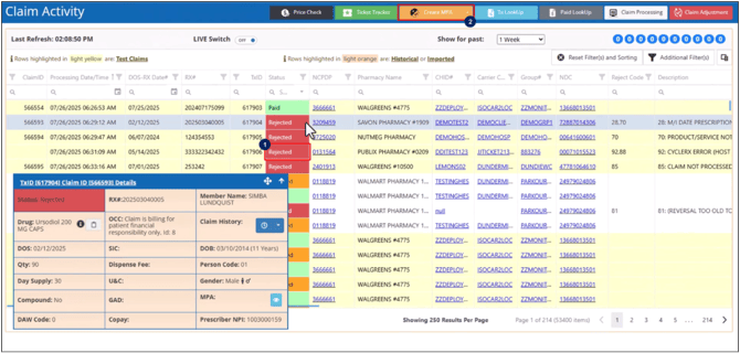 When you go to the Claim Activity tab, the live real time window updates as claims are adjudicated, showing claim status, such as paid, rejected, or reversed. This negates the need of waiting 24 hours for data refreshes.