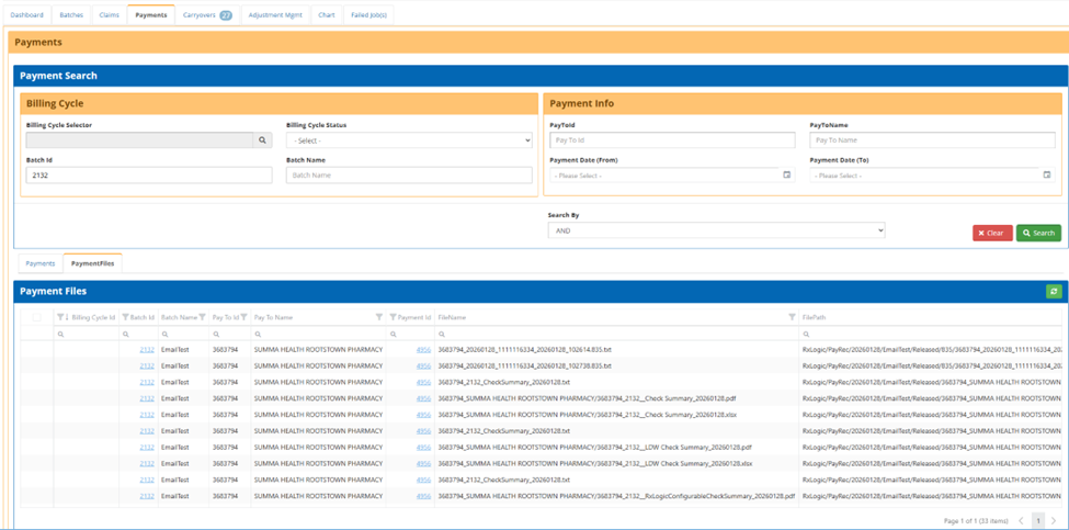 - Select the PaymentFiles Tab in the grid at the bottom of the screen