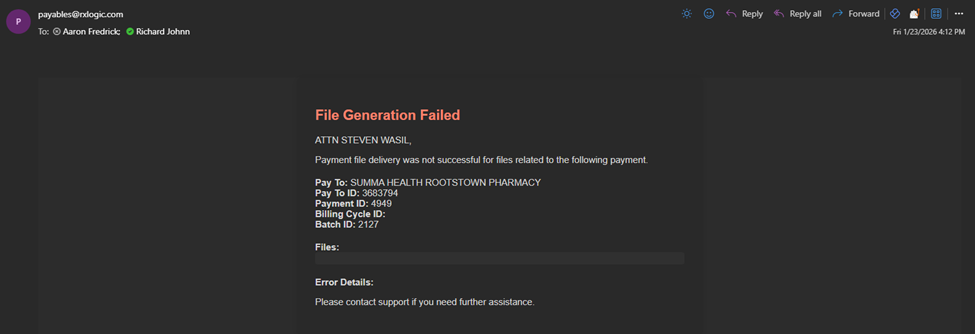 The UI displays delivery status, sent and acknowledged timestamps, and provides error messaging when the delivery fails (these failure details are logged). Successful deliveries trigger notifications to the designated “File Distribution Email” contacts on the Pharmacy and Payment Center Managers, while failed deliveries generate alerts sent to the distribution list configured in the PayRec Organization settings.