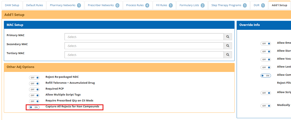 Plan Configuration Option to Return Multiple Reject Codes (30108 / 30822) – A new plan-level setting on the Add’l Setup tab, Capture All Rejects for Non Compounds, allows multiple reject codes identified during claim processing to be returned together instead of stopping at the first reject. This allows visibility into up to 4 applicable rejection reasons at once. This behavior applies to non-compound claims and continues to respect existing MPA Overrides.