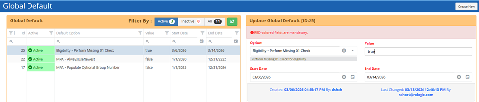 Standard Eligibility – Configurable Primary Person Code Enforcement per Client (29979) – A new Global Default option, "Eligibility - Perform Missing 01 Check" was added. When True, the Standard Eligibility will enforce that the 01 member must exist on system or on the file before adding dependent members.