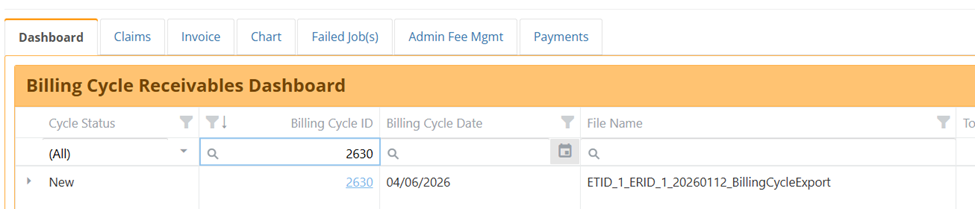 Addition of Column Header Filters to Dashboard (29968) – Filters on the Cycle Status, Billing Cycle ID, Billing Cycle Date, and File Name columns were added to the Dashboard grid.