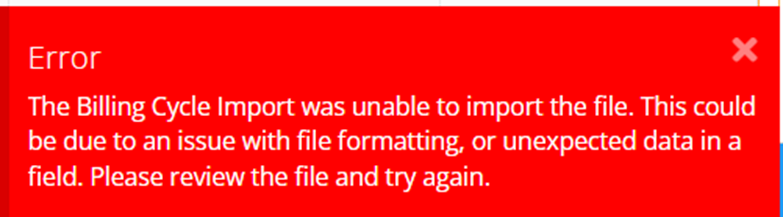 - Billing File Import – Improved handling of scenarios where all or a portion of the Billing Cycle import failed. An error message is now displayed, and the billing cycle is placed in a Failed status. This same update was made to Receivables. (20448)