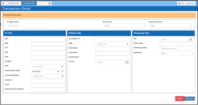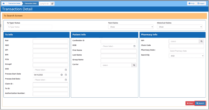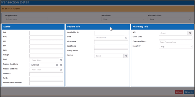 The Transaction Details module enables you to find and view claim transactions with different search parameters. A claim’s transaction details provide a complete overview of the data submitted in the claim, the claim processing results, and the claim’s transaction status.