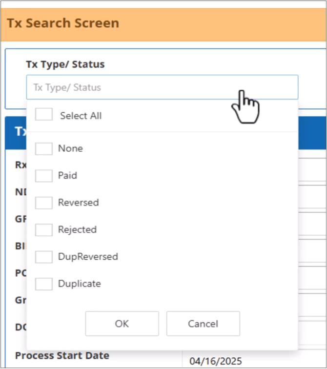 Select a Transaction Status from the Tx Type/Status dropdown list and click OK.
