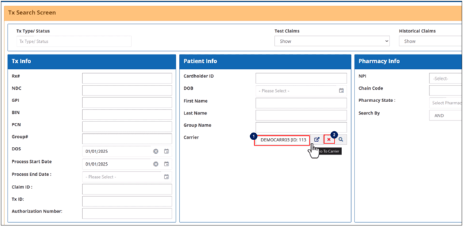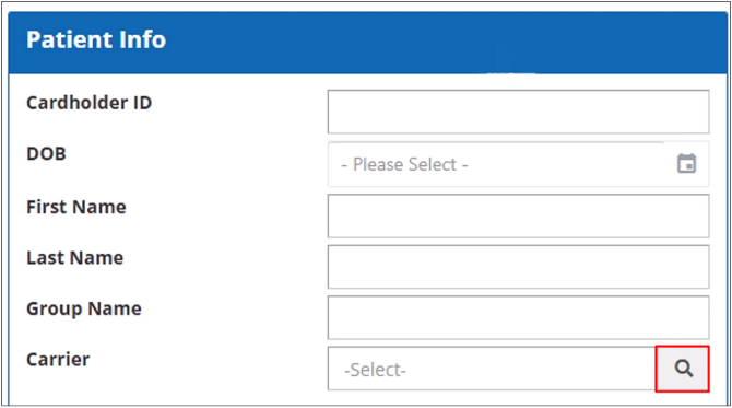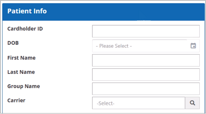 The Patient Info section contains the fields to search the transactions using the member details like the cardholder ID, date of birth, first and last name and group and carrier names.