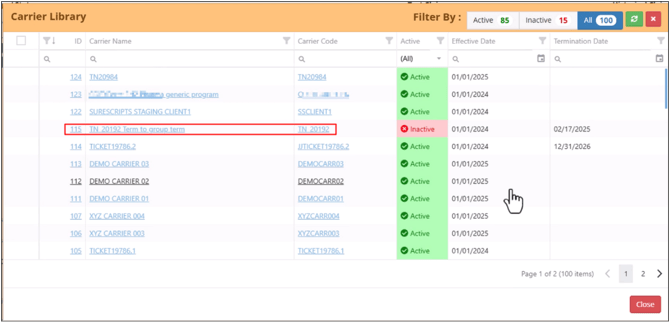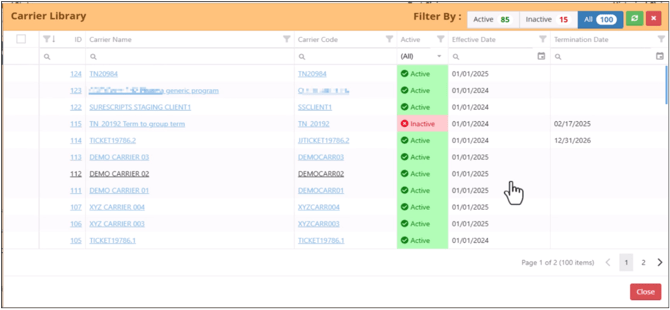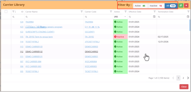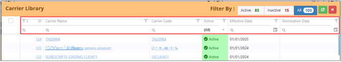 With the help of the Filter-By option in the top right corner allows you to view only active or inactive carriers.