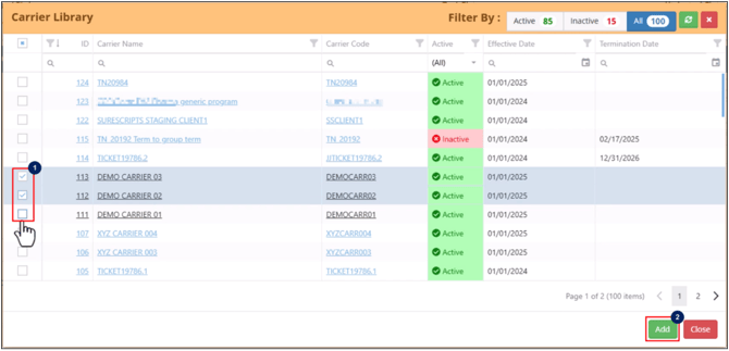 - Select one or more carriers through the checkboxes in the left side of the row.