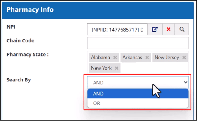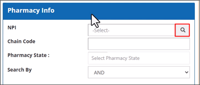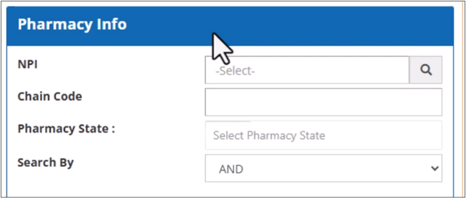 The Pharmacy Info section allows you to search for the transactions by the claim’s pharmacy details, like the NPI number, chain code number, and state.
