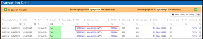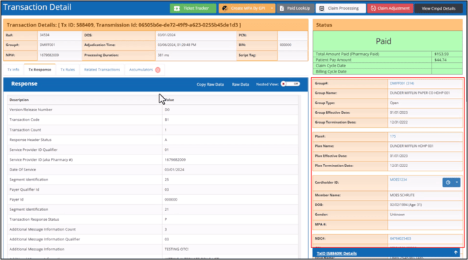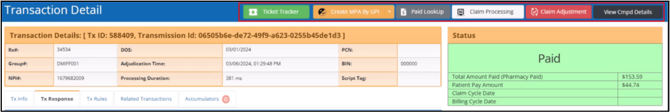 This section follows the same color codes as the transaction status column of the search results grid to highlight the transaction’s status. It also shows the total amount paid to the pharmacy and the claim and billing cycle dates.
