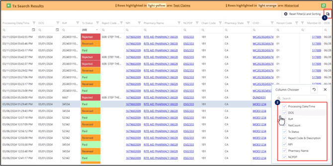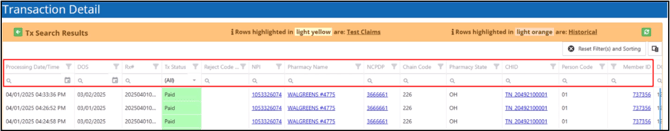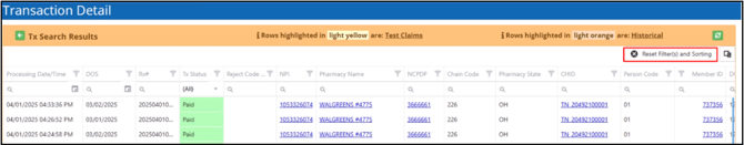 If a claim has multiple transactions, you can use the column header options to search, sort and filter the grid.