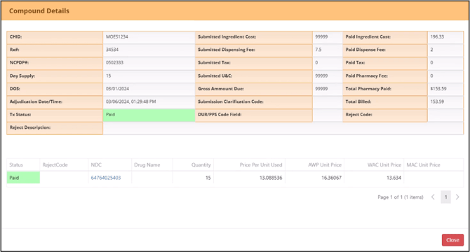 The View Compound Details shows the compound drug’s ingredient cost and other billing information.