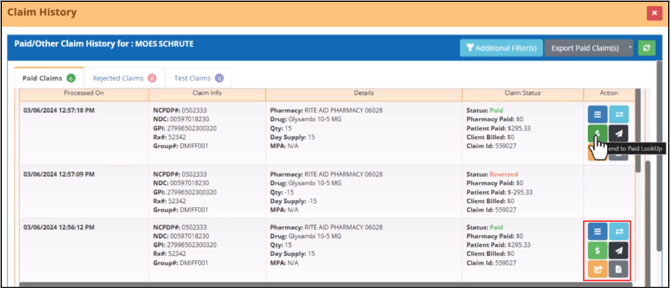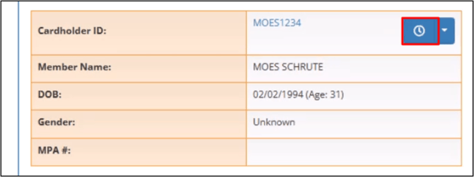 By clicking the Clock button next to the Cardholder ID link, you can view the member’s claim history.