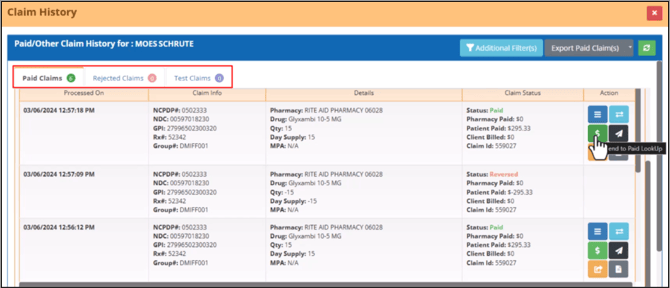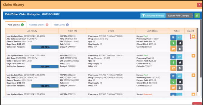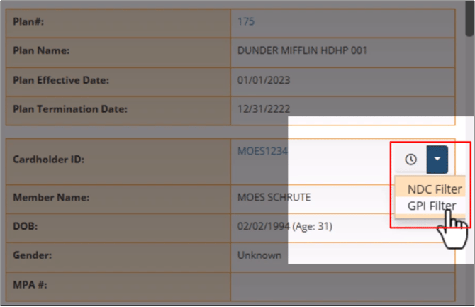 You can also use the Arrow icon to filter the claim history by NDC and GPI.