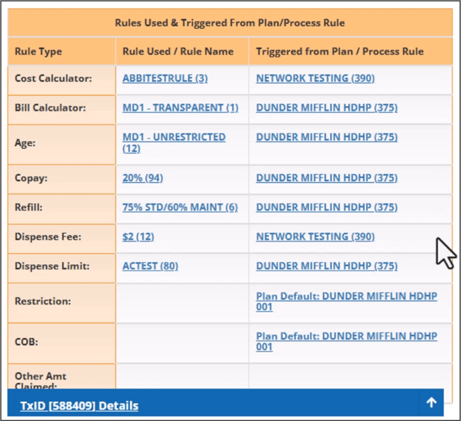 The lower half of the Transaction Details screen shows the Process Rules that were triggered when the claim was processed. The right column shows whether the rule was configured in the Plan Default rules or as a Process rule.