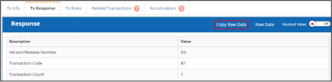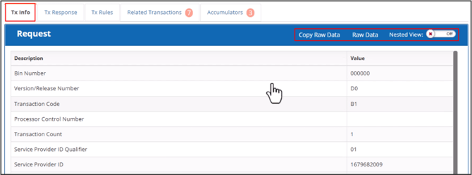 The Transaction Info tab shows the values submitted by the pharmacy. You can use the Copy Raw Data and Raw Data buttons and the Nested View toggle that work the same as the Transaction Response tab.