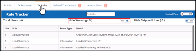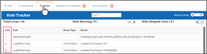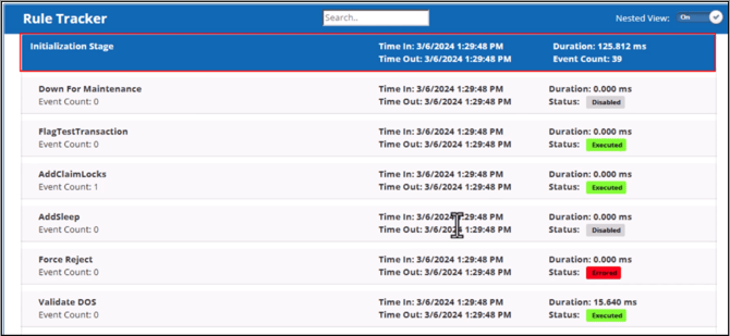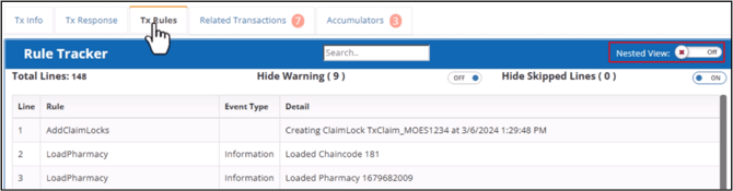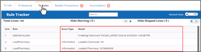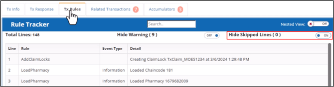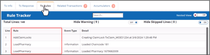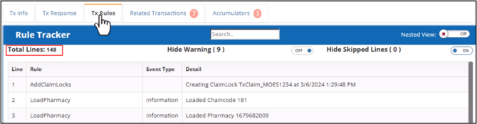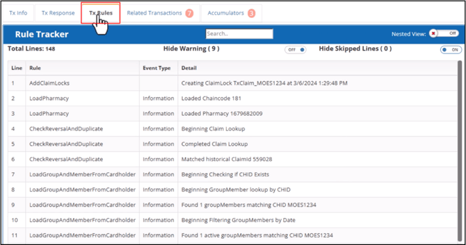 This tab displays the claim processing steps from beginning to end. The Rule Tracker grid is automatically filtered and updated as you type search terms in the search field.