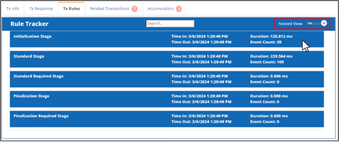 Each rule shows its processing time details. To expand it and display individual event lines, select a rule. The event type and detail show the same information available in the basic view. The nested view adds a timestamp column for each event line. To open or view the Process Rule Configuration, switch to the Basic view and find its event line.