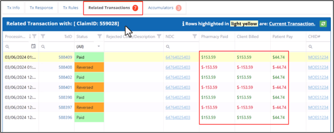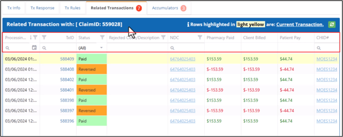 The Related Transaction tab shows the claim’s transaction history. The number next to the tab name indicates the total number of related transactions for a claim. The Current Transaction is highlighted in Yellow. The Paid Amounts are highlighted in Green and the Reversed Amounts in Red.